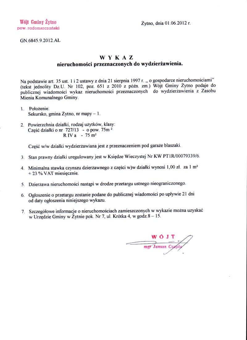 Wójt gminy Żytno podaje do publicznej wiadomości wykaz nieruchomości przeznaczonych do wydzierżawienia w trybie bezprzetargowym w gminie Żytno. Borzykówka, dz. nr 749/1 o pow. 0,5 ha. Czechowiec, dz. nr 643, o pow. 0,31 ha. Pukarzów dz. nr 58/3 o pow. 0.77 ha |